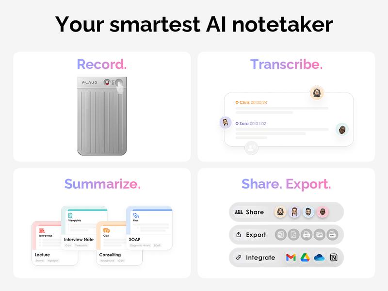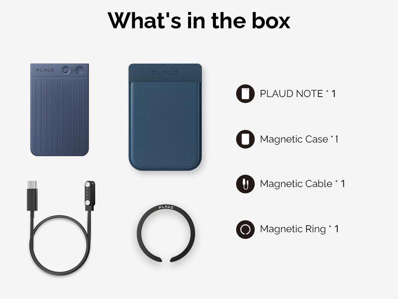 PLAUD NOTE:-MagSafe Case-MagSafe Ring-Charging Cable-Type-C Adapter-User Guide & Warranty Guide-Free PLAUD App-Free 300 mins/mo of GPT-4o Transcription & SummarizationΒ·Orders will ship within 3-5 days.Β·With the free starter plan, you're provided with free 300 mins/month of GPT-4o transcription and summarization. For additional minutes, please upgrade to the Pro Plan or buy the quota.Β·A free black Magnetic Case is already included in the PLAUD NOTE package with purchase. If you need another color, please purchase it separately here.